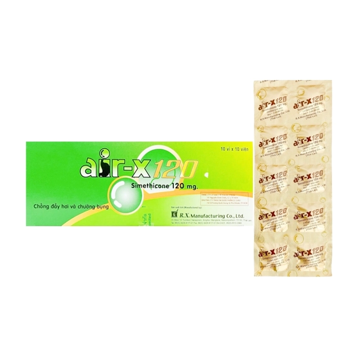 - Air-X 120 làm giảm đáng kể triệu chứng và loại bỏ khí gây chứng đầy hơi. Thành phần hoạt tính quan trọng của Air-X 120 là simethicone, không được hấp thu vào dạ dày và ruột, do đó thường không có bất kỳ tác động gây hại nào cho cơ thể.