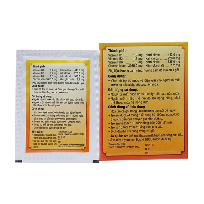 - Vitamin B1 1.2mg, Vitamin B2 1.2mg, Vitamin B6 1.5mg, Glucose khan 3055mg, Natri citrate 443mg, Kali clorua 535mg, Kẽm gluconat 1.2mg. Tinh dầu cam vừa đủ 1 gói .