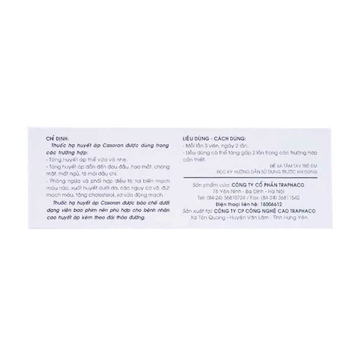 Công dụng của Casoran Traphaco 5 vỉ x 20 viên - Thuốc huyết áp