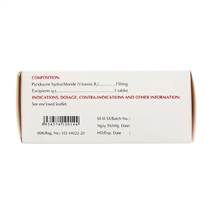 - Pyridoxine hydrochloride (Vitamin B6) 250mg.