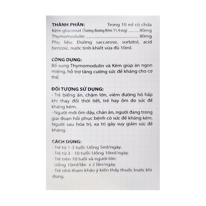 - Kẽm gluconat (Tương đương kẽm 11,4mg): 80mg